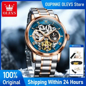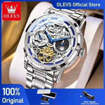 OLEVS 6670 Mens Watch Luxury Skeleton Mechanical Watch Moon Phase Stainless Steel Watches Man Gifts Box Reloj