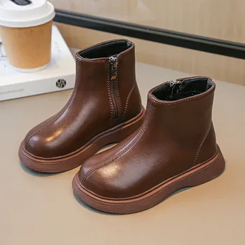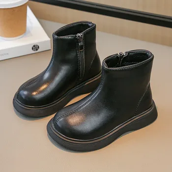 Children Fashion Boots Simple Girls Ankle Boot Black Kids Short Leather Boots Side Zipper Thick Bottom Autumn Winter 2024 New