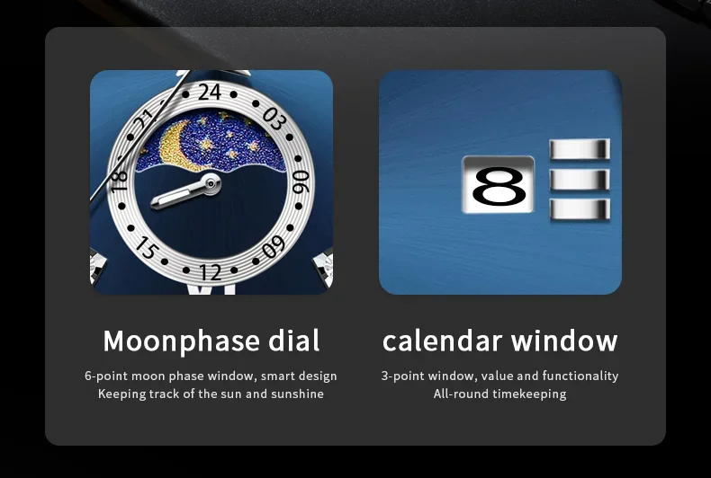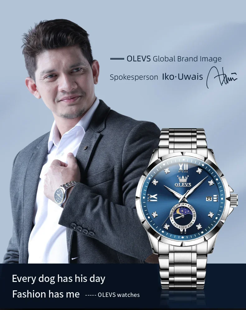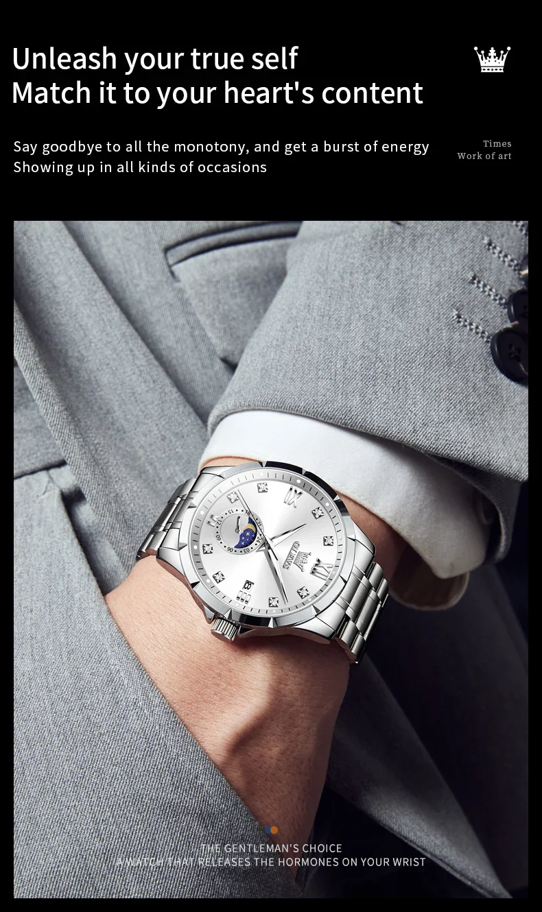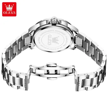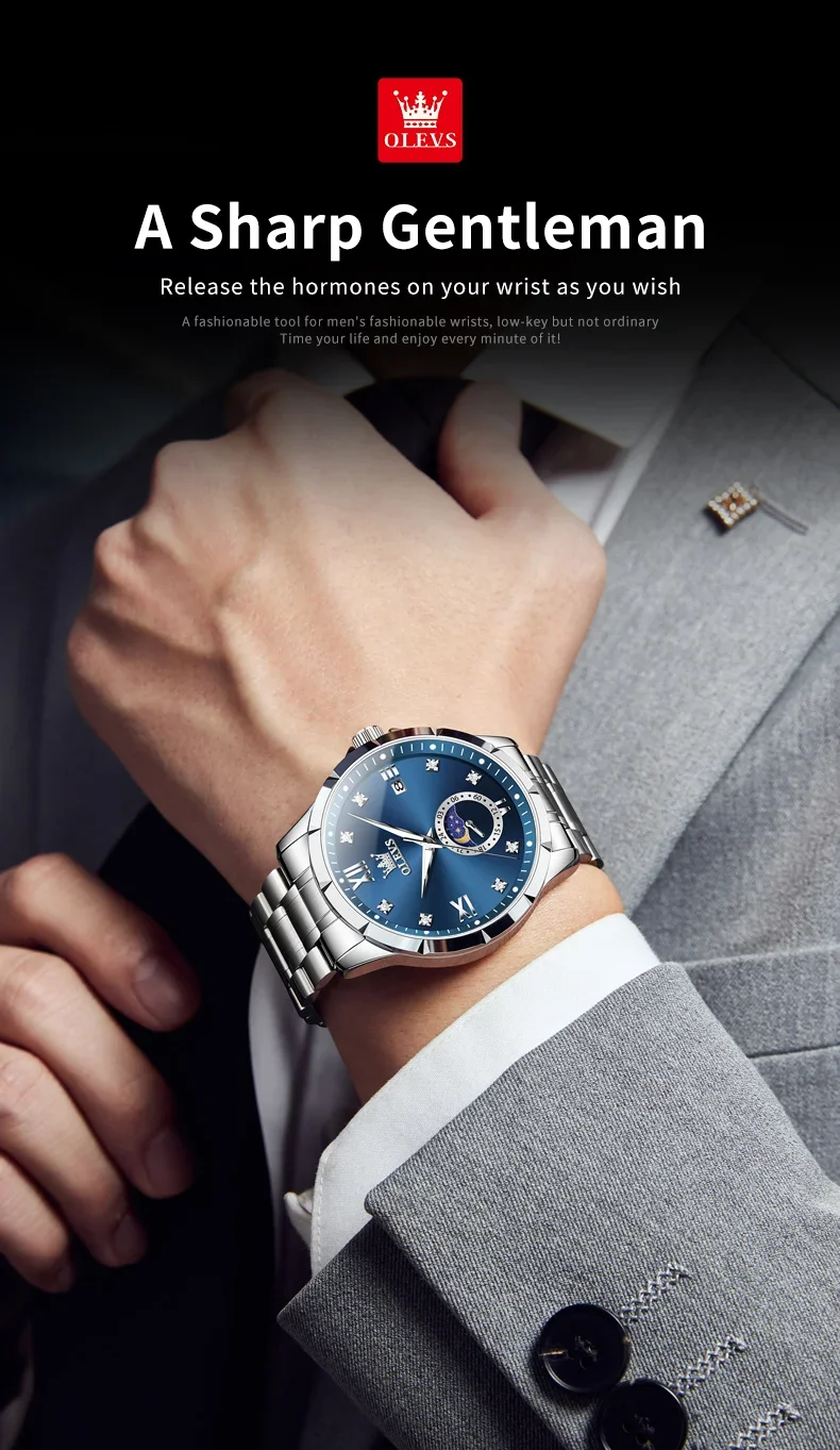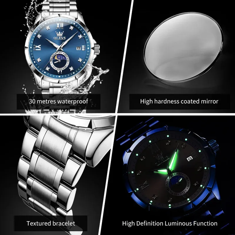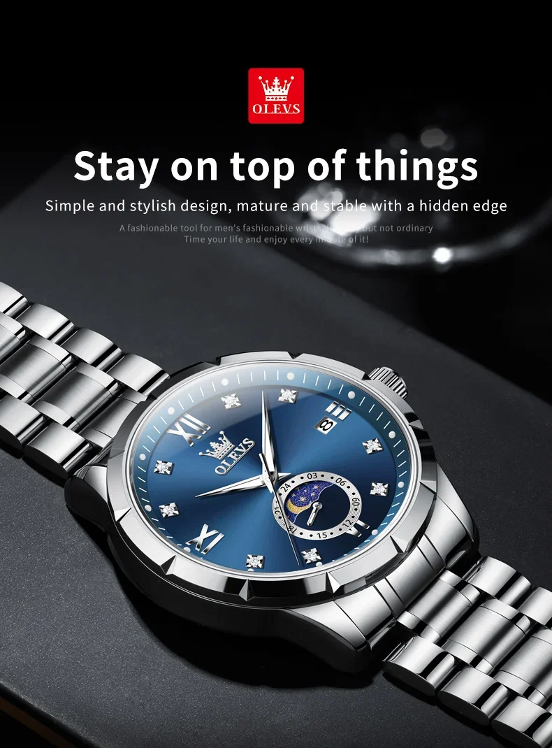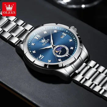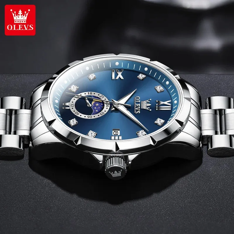 OLEVS 2956 Men’s Quartz Watch Moon Phase Solid Stainless Steel Waterproof Wristwatch with Calendar 45mm Dial