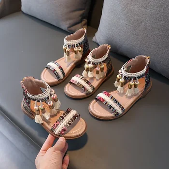 Girls Sandals Ethnic Retro Children Fashion Casual Shoes Tassels 2024 Back Zipper Summer New Sandals Kids Pattern GLADIATOR Cute